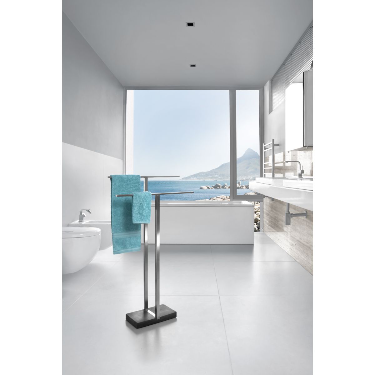 Toallero pequeño de la serie Modo, fabricado en acero y recubierto con una capa de titanio que le confiere una excepcional resistencia a los arañazos y la corrosión.
