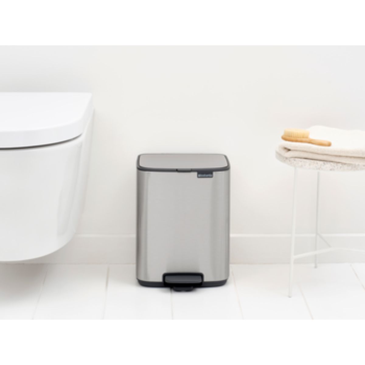 ¿Busca una papelera con el tamaño perfecto para cualquier habitación? La papelera de pedal Bo de Brabantia, con una capacidad de 7 litros, es justo lo que necesita Gracias a su diseño que ahorra espacio, puede colocarse fácilmente en una esquina o contra una pared. Con su base antideslizante y su cierre antivuelco, es una papelera robusta. La tapa puede abrirse higiénicamente presionando el pedal o manualmente utilizando el asa de la tapa. La función "stay-open" también permite cambiar fácilmente los cartuchos. ¡Una papelera que triunfa!