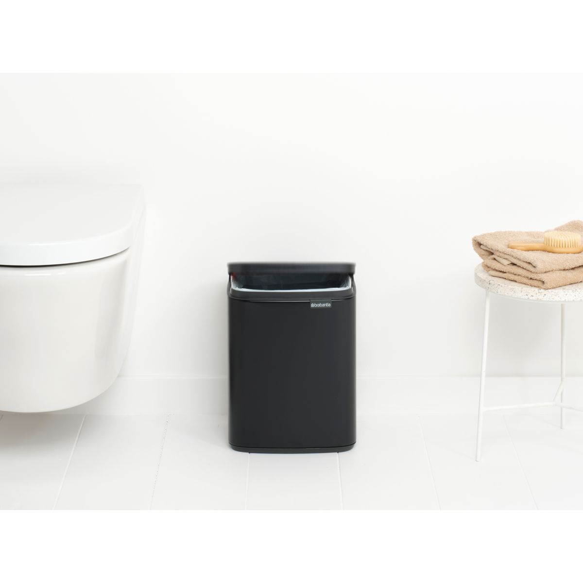 Ni demasiado grande, ni demasiado pequeño: justo lo que necesitas. Esta es la papelera Bo7 l de Brabantia para ti Puedes colocarla en un rincón o colgarla en la pared. Y puedes hacerlo en cualquier sitio, porque la tapa es fácil de levantar desde los lados izquierdo y derecho y desde la parte delantera de la papelera. Se acabó el agacharse para meter las cosas. La cesta de los sueños