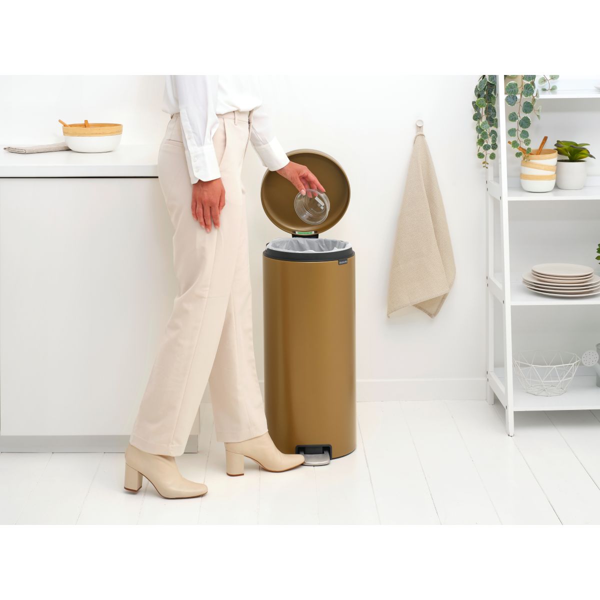 La papelera con pedal NewIcon (30 litros) de Brabantia es aún más icónica gracias a su acabado metálico en tonos cálidos y su elegante pedal de acero inoxidable. La papelera añadirá elegancia y lujo a su interior, y es muy estable gracias a su base antideslizante y cierre antivuelco. La exclusiva función de caída silenciosa también garantiza un cierre suave. Por supuesto, NewIcon es fácil de abrir, resistente a los olores, higiénico y cómodo de limpiar. 30 litros de diseño atemporal.