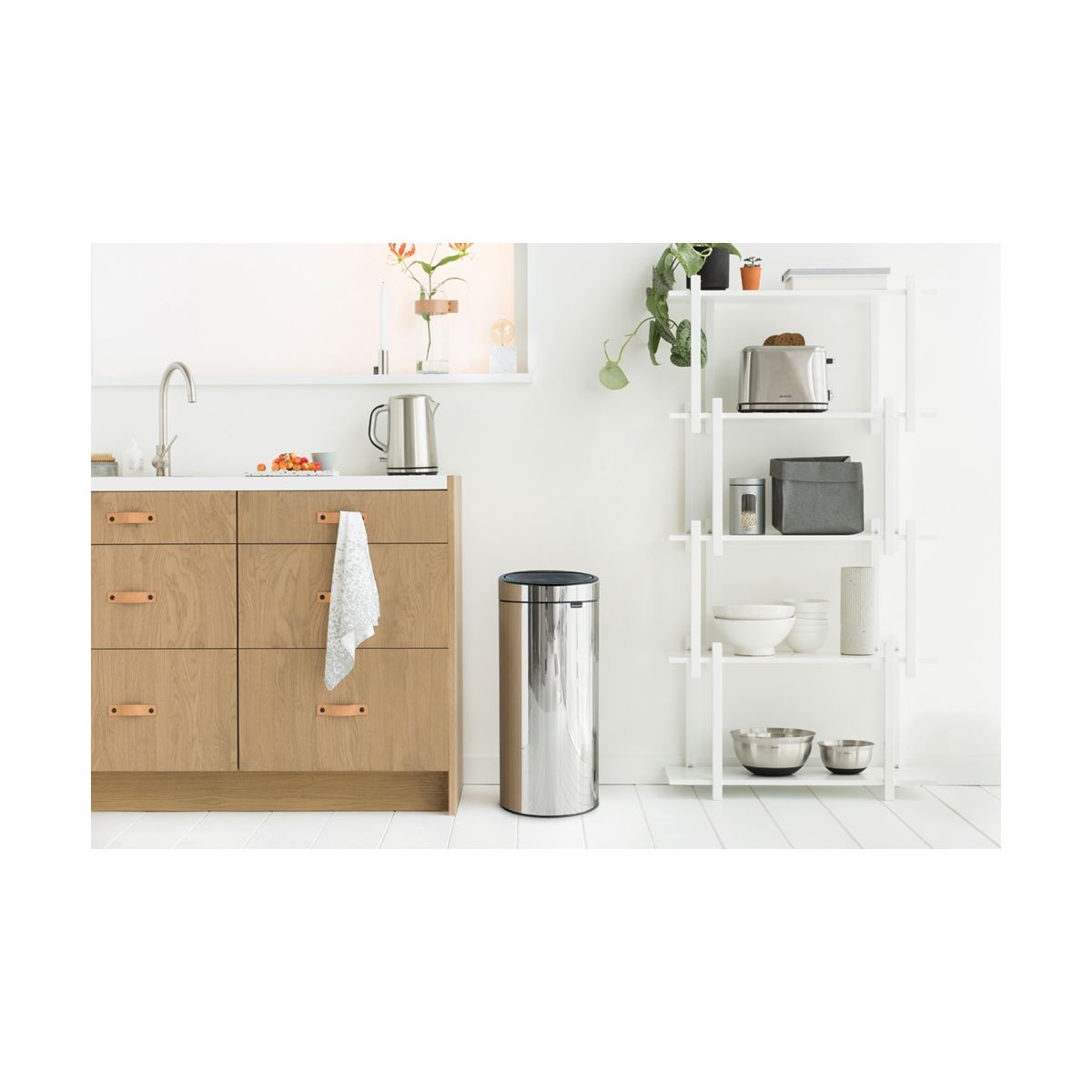 Contenedor táctil de Brabantia con capacidad para 30 litros. Basta con tocar la tapa para que se abra suavemente. Es muy fácil de abrir, cambiar las bolsas de basura y limpiar. Este contenedor táctil tiene forma redonda, es resistente y protege el suelo con un borde protector. Disfrute de un uso intensivo y sin complicaciones