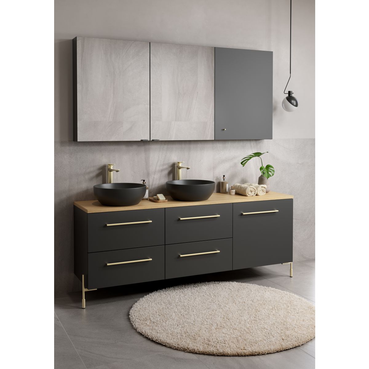 Mueble de baño de la colección Larga en color antracita en tamaño 100. El frente y el cuerpo son de aglomerado de alta calidad, lacado en un elegante color antracita. El mueble tiene dos cajones de gran capacidad que ofrecen mucho espacio para guardar cosméticos, toallas y accesorios de baño. Su interior está acabado en un elegante color gris, que armoniza con el frente antracita, creando un conjunto estéticamente coherente. El sistema de cierre suave hace que los cajones se cierren suave y silenciosamente, aumentando la comodidad de uso. Un elemento característico del mueble es el tirador fresado, que acentúa su estilo minimalista. Este tirador está disponible en tres colores -plateado, dorado y negro-, lo que le brinda la oportunidad de personalizar el mueble y combinarlo con otros elementos del mobiliario de su cuarto de baño. El tirador debe adquirirse por separado. El tablero con el que está fabricado el mueble cuenta con la certificación FSC MIX CREDIT SGSCH-COC-007574.
