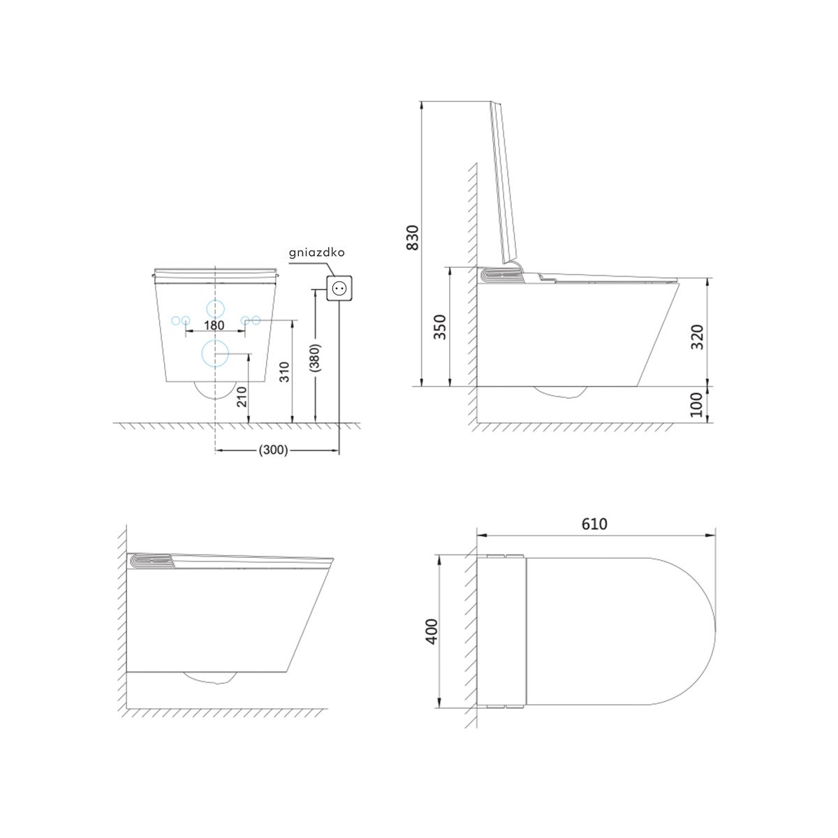 Características: apertura y cierre automáticos, asiento con calentamiento, iluminación, regulación de temperatura del agua, brazo de boquilla autolimpiante, secado con aire