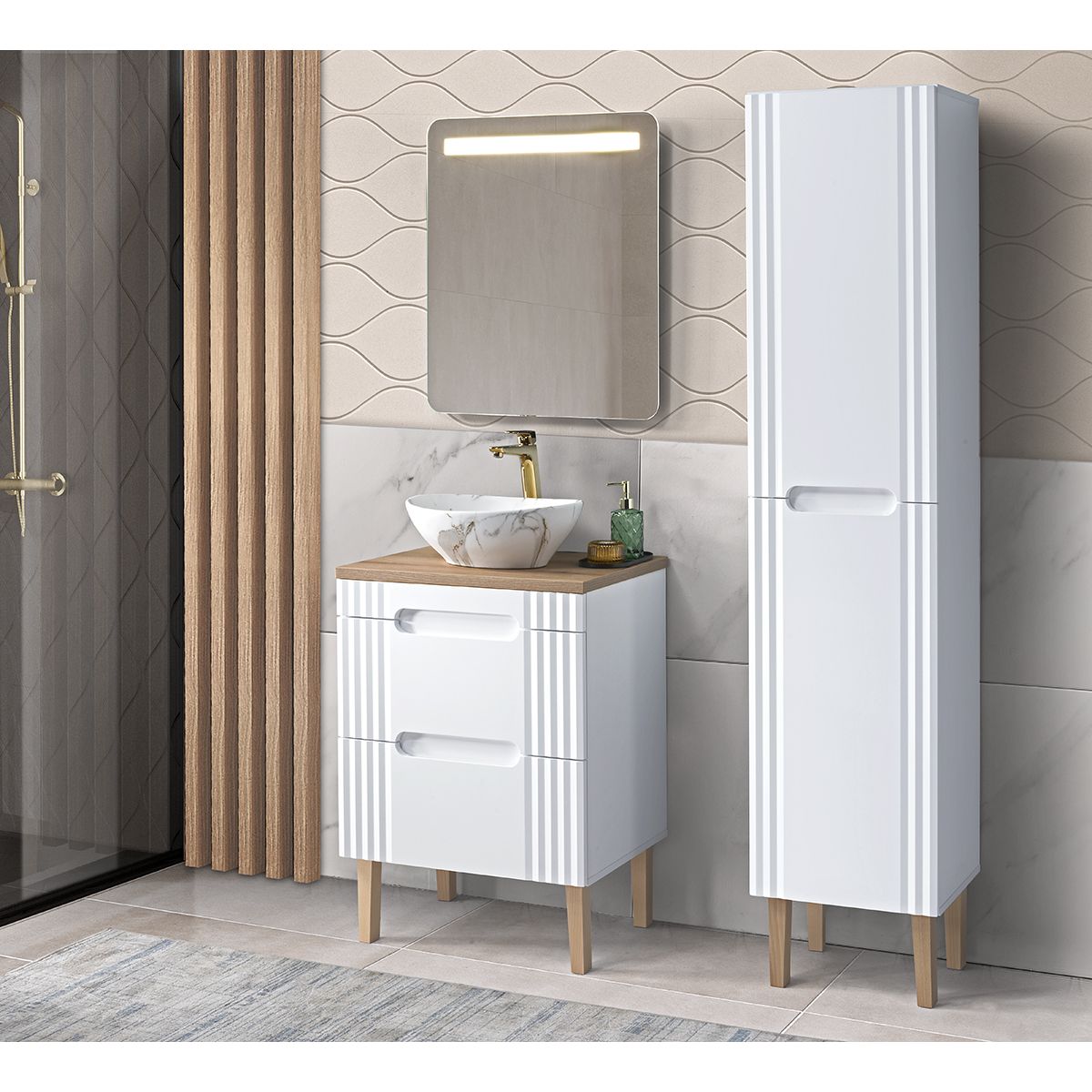 Fiji es una colección que combina modernidad y estilo atemporal. Los muebles de esta línea pueden montarse tanto colgados como de pie sobre patas de madera. La colección incluye un pedestal alto, armarios bajo lavabo y encimeras de color Coastal Oak Evoke en tamaños de 60 cm, 80 cm, 100 cm y 120 cm. Los tiradores se han sustituido por un moderno bajo mueble fresado y los frentes de los armarios se distinguen por un delicado pliegue en los laterales.