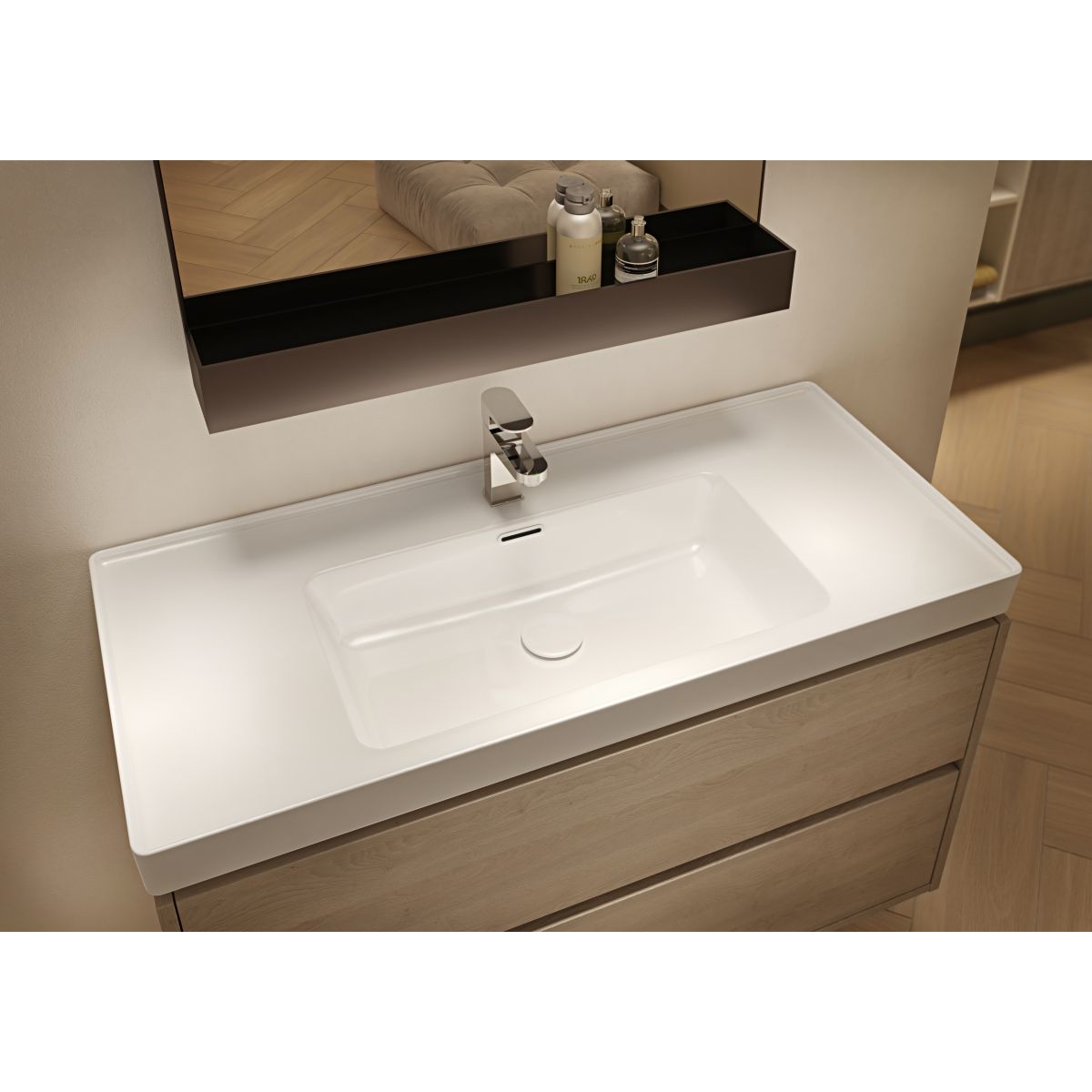 El juego incluye un armario suspendido CREA 50 con un mueble lavabo CREA 50. El frente y el cuerpo del armario son de aglomerado resistente a la humedad en color roble. El armario está equipado con un sistema de apertura táctil (llamado PUSH SYSTEM) y dos cajones de gran capacidad. El interior con textura de lino gris confiere al mueble un aspecto muy elegante. El lavabo CREA está fabricado en cerámica ROCKLITE, lo que le confiere una resistencia sorprendente, un peso ligero y unas paredes extremadamente finas.