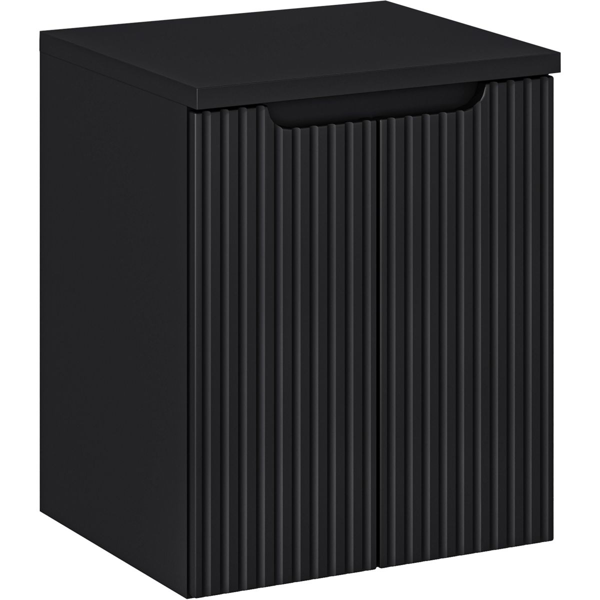 El mueble del lavabo tiene ranuras verticales fresadas en los frentes, lo que le da un aspecto moderno. El color negro mate combina a la perfección con el tirador del mismo tono. La encimera de 50 cm de ancho complementa perfectamente el conjunto, dándole un aspecto elegante y con estilo.
