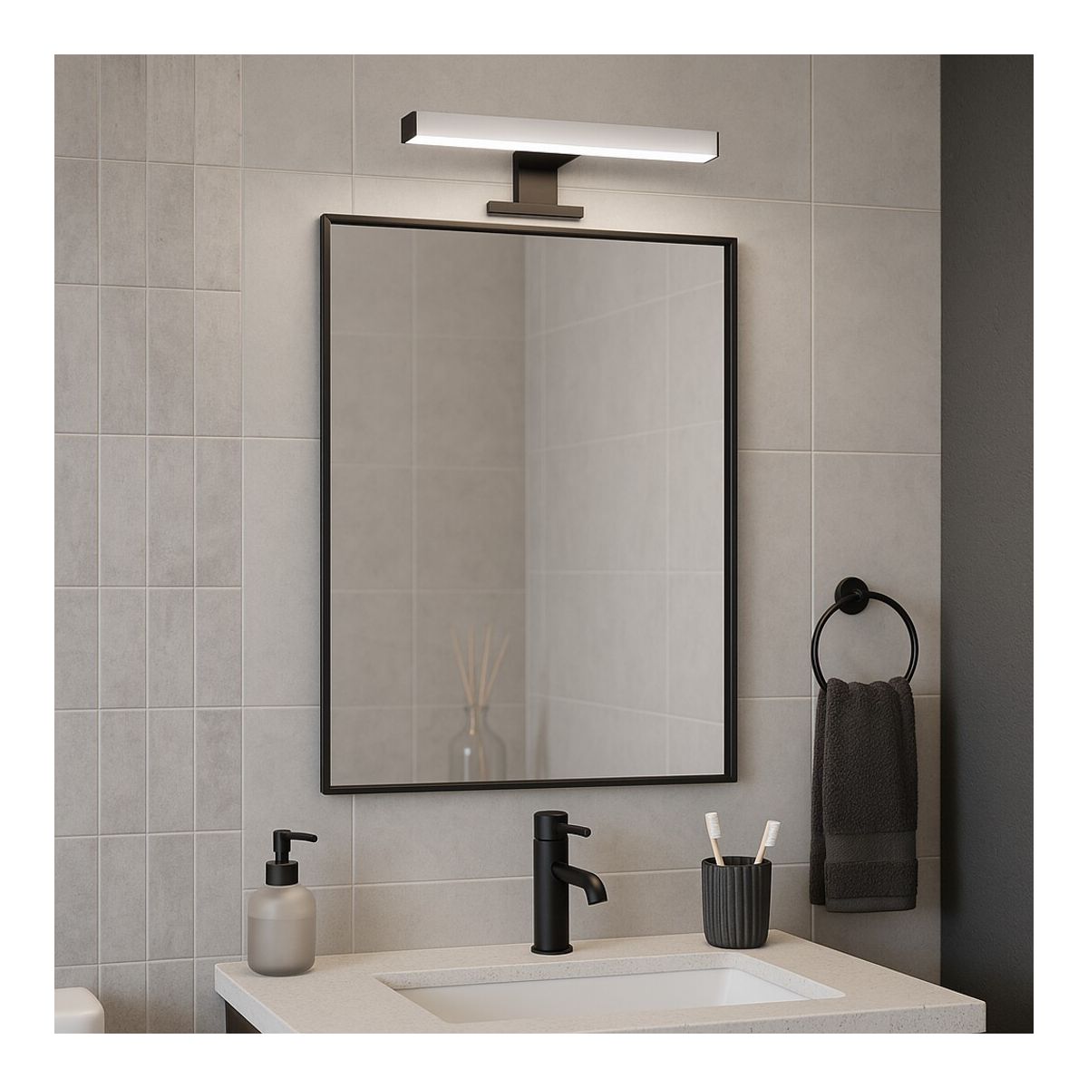 El espejo de baño Silia es el complemento ideal para cualquier cuarto de baño moderno. Destaca por su forma asimétrica única, que no solo tiene una función práctica, sino que también es una verdadera decoración para la habitación. Tiene un marco de aluminio duradero con un acabado negro mate y combina perfectamente con los accesorios del mismo color. Además, el espejo Silia ofrece la posibilidad de instalarlo en cuatro configuraciones diferentes, lo que permite adaptarlo a las necesidades personales.