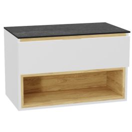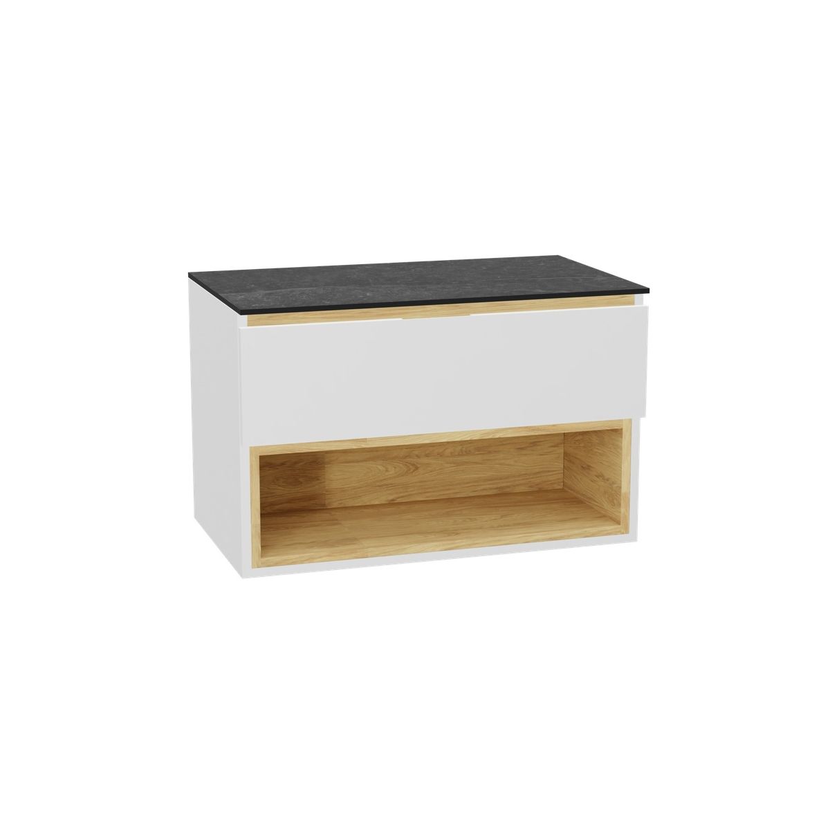 Mueble de lavabo moderno Tuto 2.0 con un cajón de gran capacidad y un práctico compartimento de almacenamiento abierto. Los frentes se suministran completos con tiradores. Todos los frentes son de un color a juego con el cuerpo del mueble. El mueble combina a la perfección funcionalidad y diseño moderno. La variedad de configuraciones permite que el mueble se adapte al estilo individual y a las necesidades de cualquier cuarto de baño. Los frentes de los cajones se suministran con tiradores incluidos. El armario y el cajón se suministran totalmente montados. Los frentes y la encimera/fregadero se montan por separado.