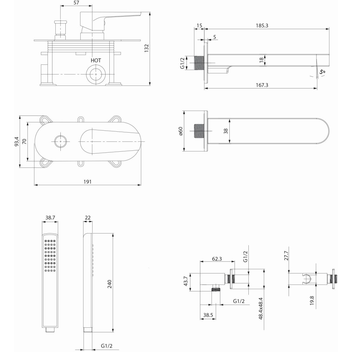 El juego incluye: un mezclador (S951-305), un juego de ducha con conexión en ángulo (S951-708), un caño de bañera (S951-556). Los componentes del juego se embalan por separado.