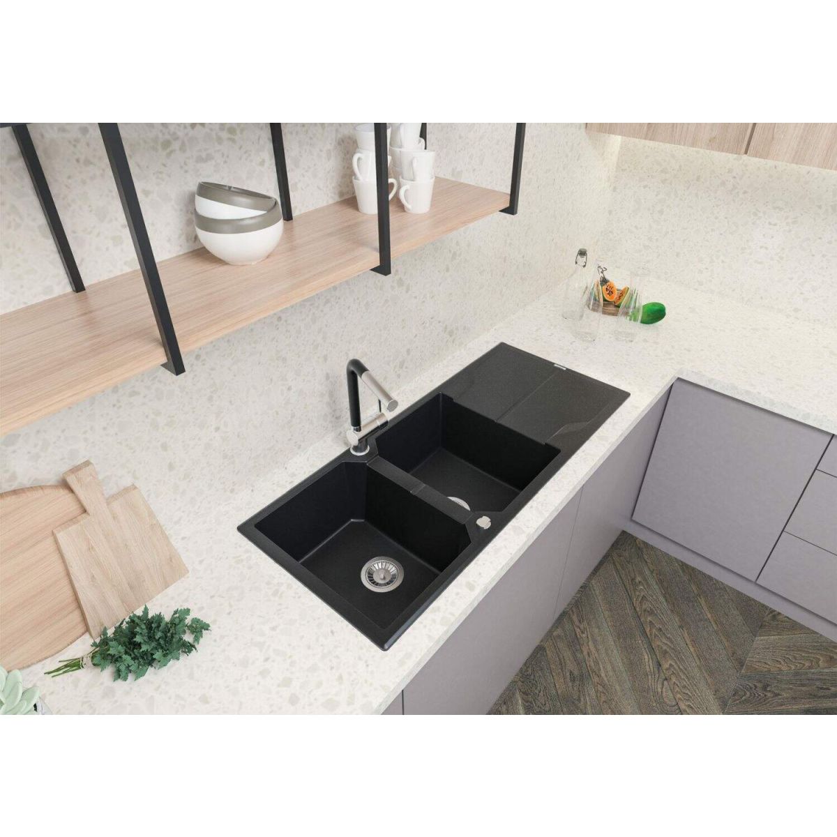 El fregadero de granito Andante de 2 cubetas, con dos amplias cubetas rectangulares y un escurridor, es un producto que combina a la perfección un diseño y una elaboración modernos con un material de la mejor calidad, una noble mezcla de granito. Gracias a su borde estrecho y bajo, el fregadero encastrado Andante se funde con la encimera. Las dos cubetas extraprofundas y ampliadas harán las delicias de los amantes de la cocina y son perfectas para las cocinas modernas, donde la ergonomía y la funcionalidad van de la mano de la elegancia, el diseño atemporal y los materiales de alta calidad. Los fregaderos de esta colección están fabricados en granito extremadamente duro y resistente al uso y se caracterizan por su resistencia a la decoloración, los arañazos, los choques térmicos, las temperaturas de 250 grados y los impactos. Los fregaderos Andante también tienen propiedades hidrófobas, lo que significa que su superficie no sólo es impermeable a las partículas de agua, sino que también las repele, lo que facilita mucho su limpieza. Se puede adquirir un gancho y una barra para el fregadero de la gama Deante.