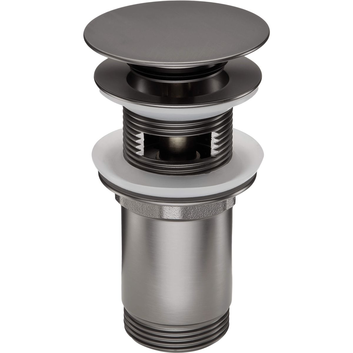El tapón redondo click-clack está diseñado para bidés y lavabos. Es un producto universal que se adapta tanto a lavabos con rebosadero como a lavabos sin rebosadero. El desagüe se abre y se cierra presionando el tapón con un dedo. El producto tiene un original acabado en titanio, que combina perfectamente con griferías del mismo color.