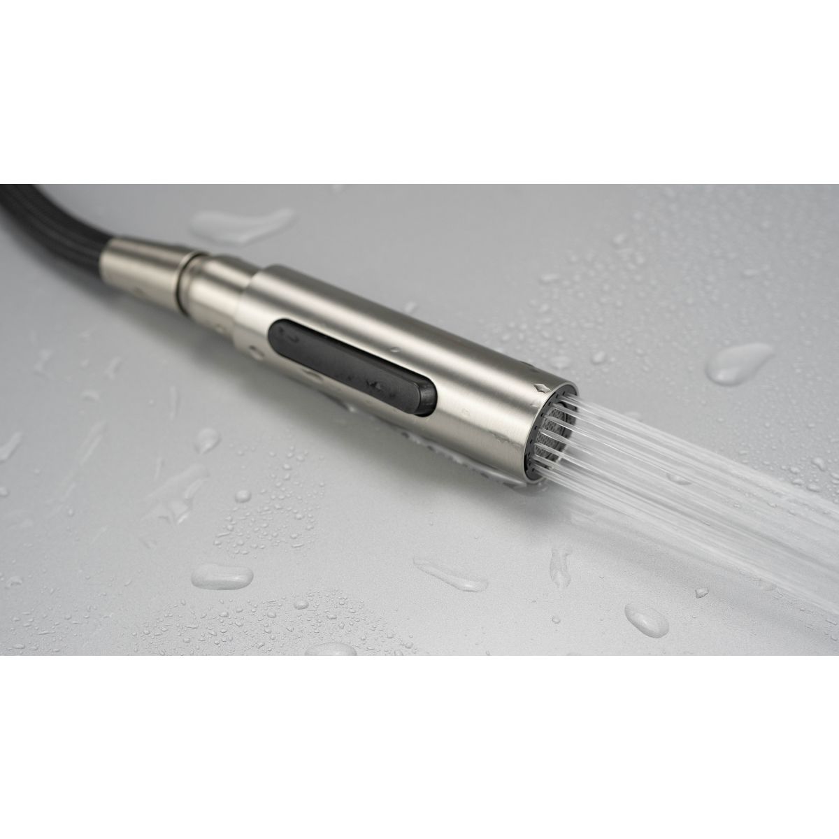 El grifo de cocina Momi, fabricado en acero inoxidable de alta calidad, destaca por su elegante caño rectangular, que le confiere un aspecto moderno. El aireador incorporado oxigena eficazmente el chorro de agua, lo que se traduce en un menor consumo. El caño extraíble garantiza un uso cómodo, ya que permite manejar fácilmente el agua en diversas tareas en la zona del fregadero. El grifo tiene dos tipos de chorro: aireado, ideal para las tareas diarias, y delicado, tipo lluvia, ideal para enjuagar verduras y frutas. El grifo Momi tiene un acabado en acero cepillado.