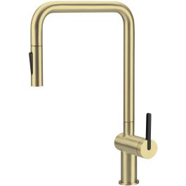 El mezclador de cocina Momi está fabricado en acero inoxidable de alta calidad y acabado en un sutil tono dorado mate. Su caño rectangular añade un toque de estilo que combina a la perfección con los interiores modernos. El aireador incorporado airea eficazmente el chorro de agua, reduciendo su consumo y garantizando la máxima eficacia. El caño extraíble facilita el uso diario, proporcionando comodidad para lavar platos grandes y llegar a zonas de difícil acceso. El grifo ofrece dos modos de funcionamiento: un chorro aireado para las tareas cotidianas y un chorro de lluvia suave, ideal para aclarar frutas y verduras.