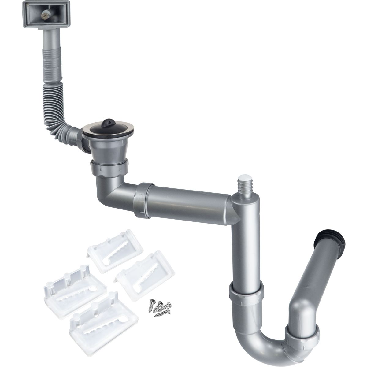 Este modelo está diseñado para fregaderos de acero superpuestos de una sola cubeta. El sifón está equipado con un tapón manual y un rebosadero rectangular.
