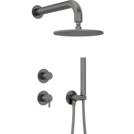 El conjunto de ducha Silia consta de un brazo mural que incluye un rociador de lluvia, un mezclador, un flexo, un mango de ducha y un conector angular. El mezclador tiene un interruptor de función mecánico de cerámica. La alcachofa de ducha de latón está equipada con un sistema antical para facilitar el mantenimiento. La manguera antitorsión no se retuerce durante el uso. El mango de ducha es de acero inoxidable de alta calidad y tiene un agradable chorro de lluvia. La conexión angular es móvil, de modo que el ángulo del teléfono puede ajustarse a voluntad. El diseño general está acabado en un interesante color titanio y encaja perfectamente en baños minimalistas.