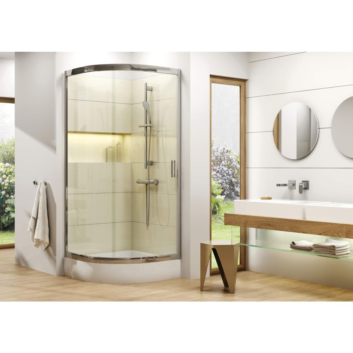 El plato de ducha semicircular está fabricado en acrílico duradero, que no pierde su brillo incluso tras un uso prolongado. Tiene salientes antideslizantes que minimizan el riesgo de resbalones. Incluye un marco metálico con patas ajustables.