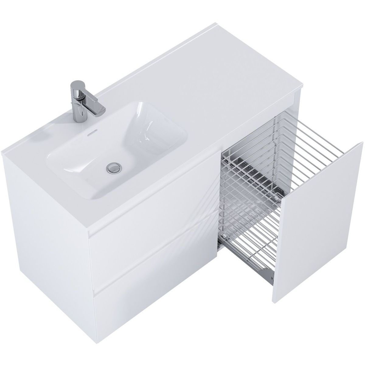 Armario bajo encimera Split 100, compuesto por un armario bajo encimera 60 y una cajonera 40 con cesta de carga, colocada en el lado derecho. El armario bajo encimera con 2 cajones con laterales metálicos, con extracción total y sistema de cierre suave. La cesta de carga de la cómoda tiene robustas guías con una capacidad de carga de hasta 20 kg, con extensión total y sistema de cierre suave. El armario está fabricado con materiales de alta calidad, frontal y cuerpo de tablero laminado, lacado en blanco mate. Tiradores moldeados perfilados a 45°. El armario puede combinarse con encimeras ElitStone.