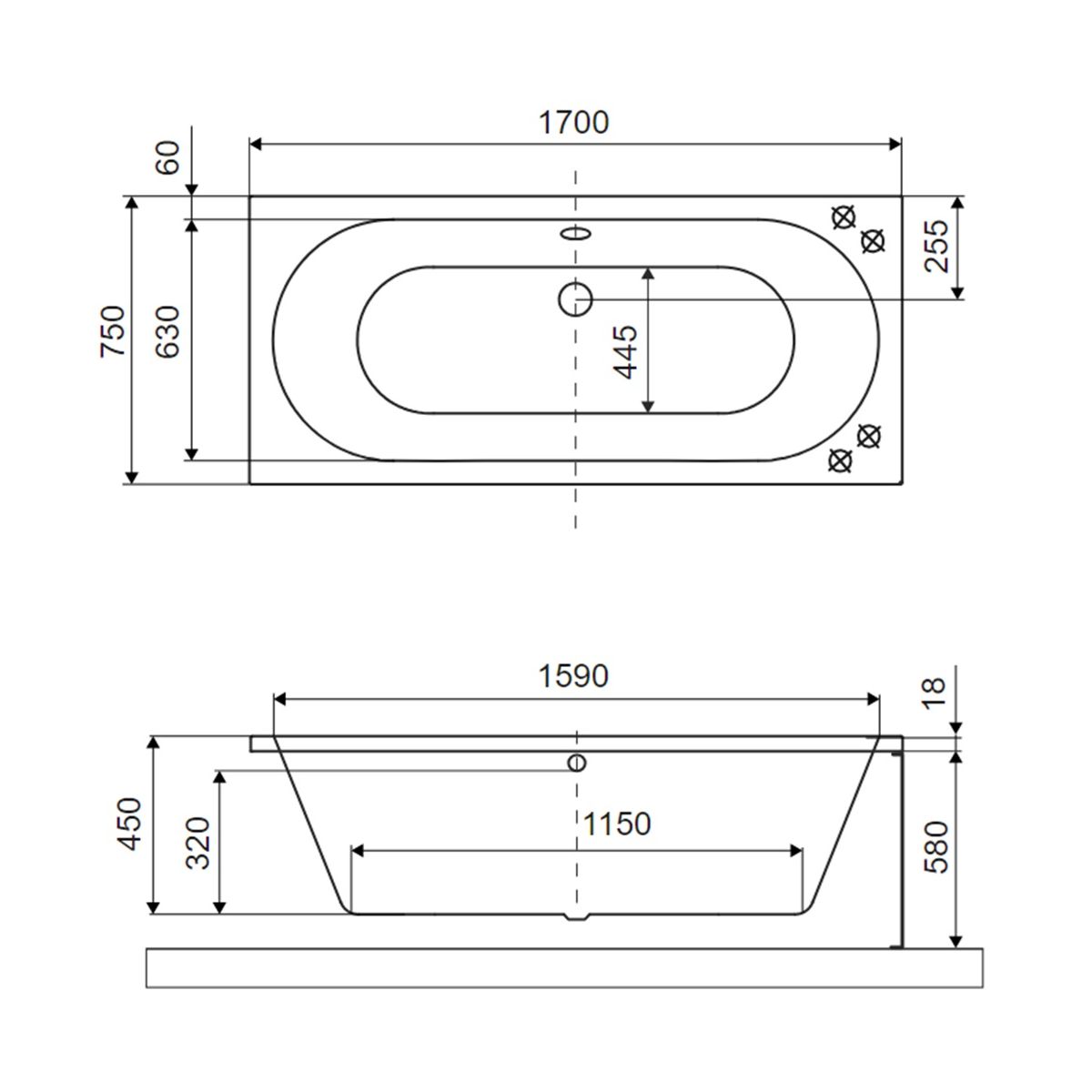 Bañera en color blanco mate. Disponible en tres tamaños: 160 x 75, 170 x 75 y 180 x 80, lo que permite adaptarla perfectamente a baños de diferentes tamaños.