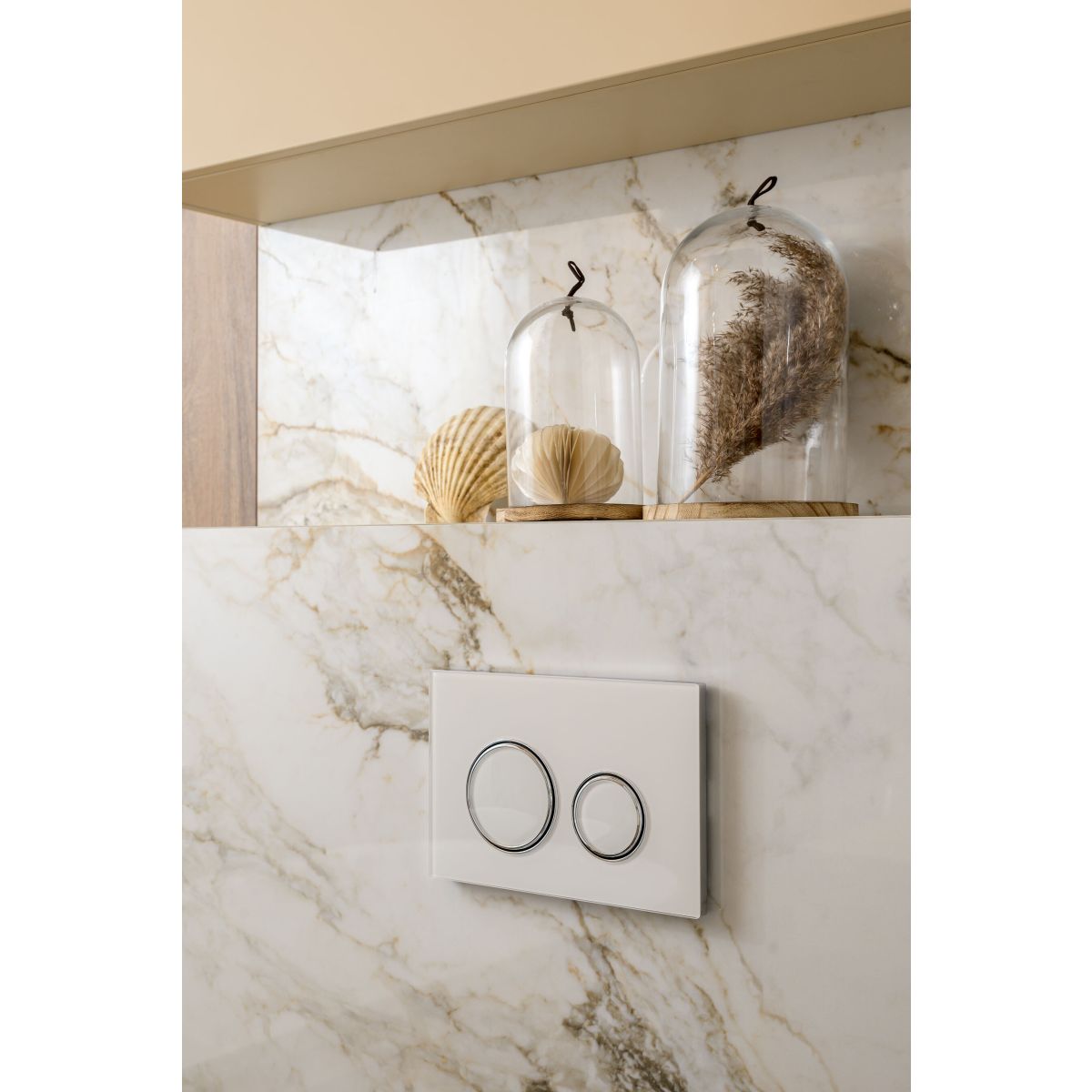 ¿Busca un complemento moderno y bonito para su cuarto de baño? El pulsador de cisterna Geberit Sigma21 es una excelente elección Su singularidad radica en la combinación de las cualidades del cristal, el plástico y el metal: la superficie de cristal de la placa de cubierta oculta un color blanco lechoso, mientras que los bordes metálicos y cromados del botón marcarán una presencia distintiva en el cuarto de baño, en correspondencia con griferías de colores similares. Combina a la perfección estilo y funcionalidad. Esta solución está diseñada para las cisternas empotradas Sigma - la instalación es sencilla, sin necesidad de herramientas.