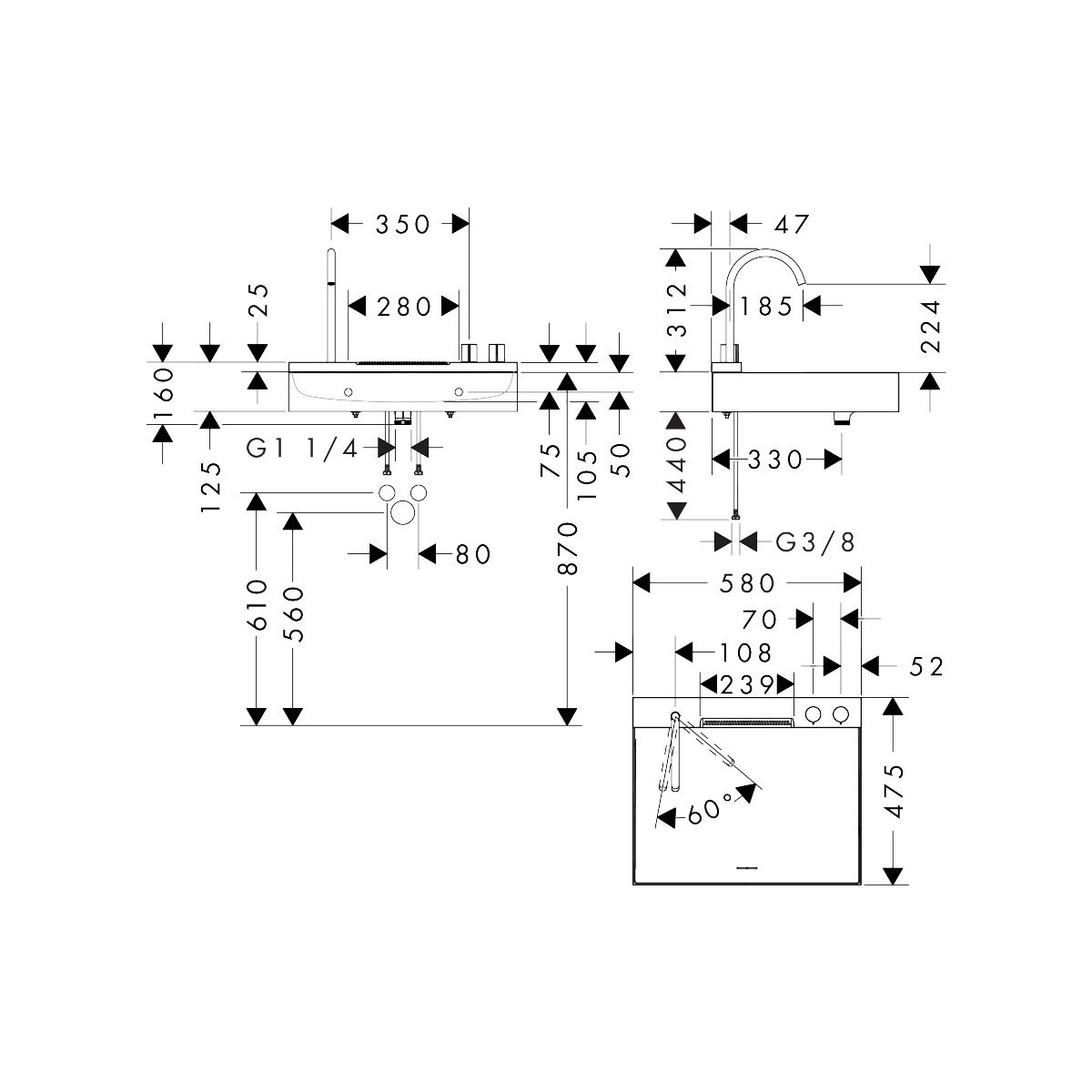 - dimensiones exteriores del lavabo: 580 x 475 x 100 mm (ancho x profundidad x alto)