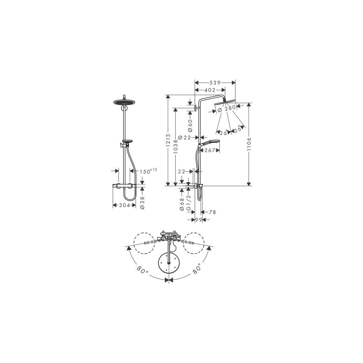 - tamaño del módulo de ducha: 280 mm