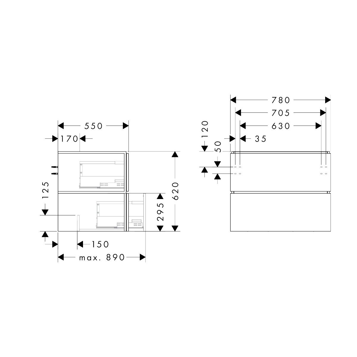 Xilesa E de hansgrohe combina diseño y funcionalidad para proporcionar una experiencia cómoda e impresionante. Los cajones se abren fácilmente gracias a la función Push-Open. No es necesario utilizar tiradores apretados. El mueble de lavabo ofrece el máximo espacio de almacenamiento - gracias al sifón que ahorra espacio (se vende por separado: #54235000), ¡no es necesario recortar el sifón!