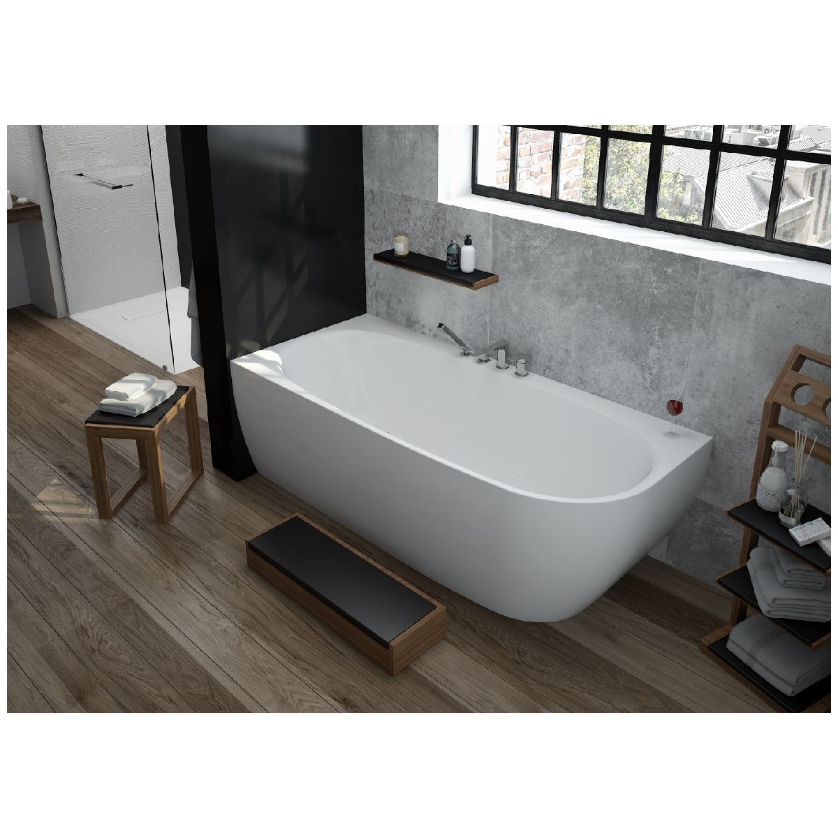 Bañera esquinera izquierda completa con rebosadero integrado, sistema de desagüe con tapón Klick-Klack, manguera de instalación de conexión.