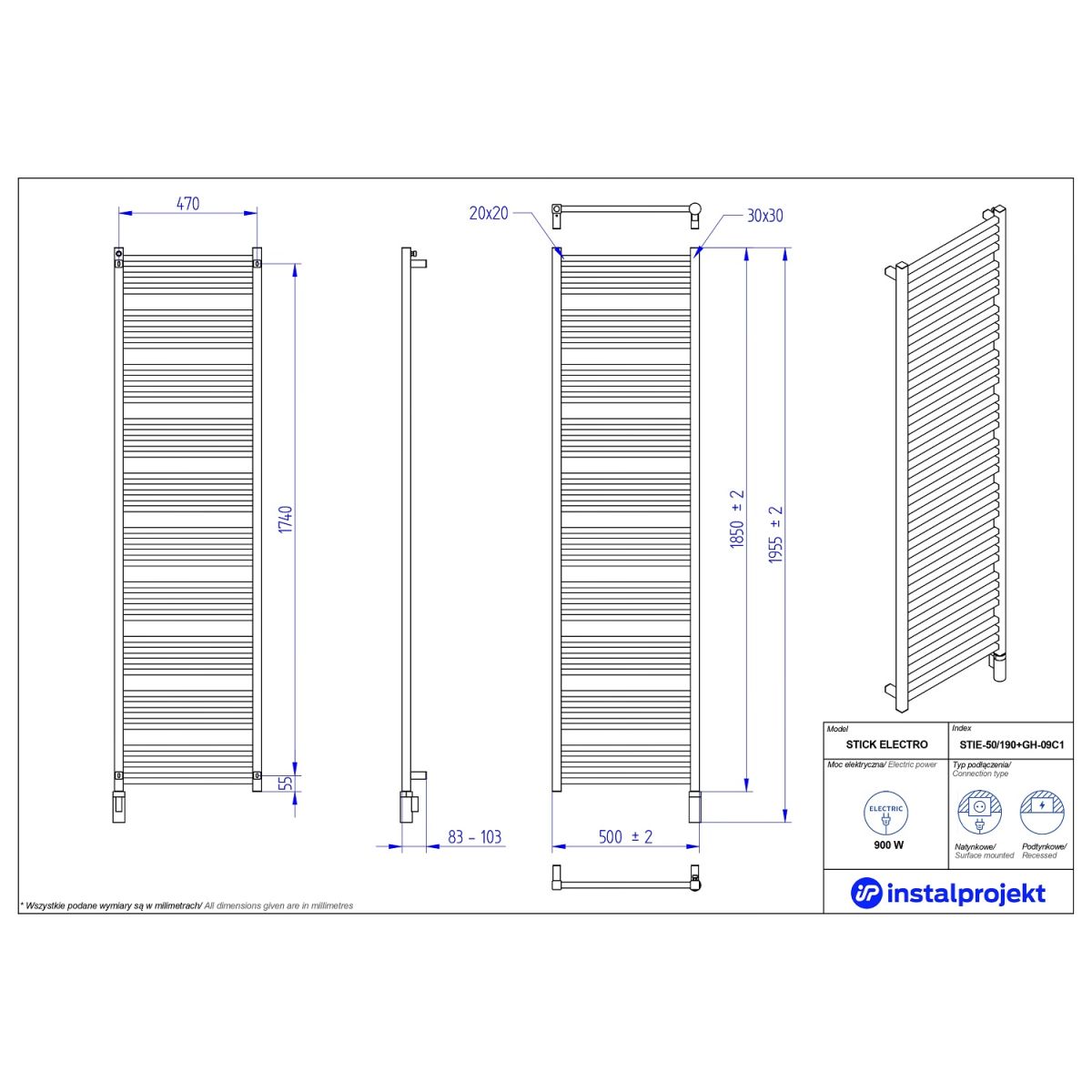 Instal Projekt Stick Electro radiador eléctrico 185x50 cm negro STIE-50/190C75+GH-09C2