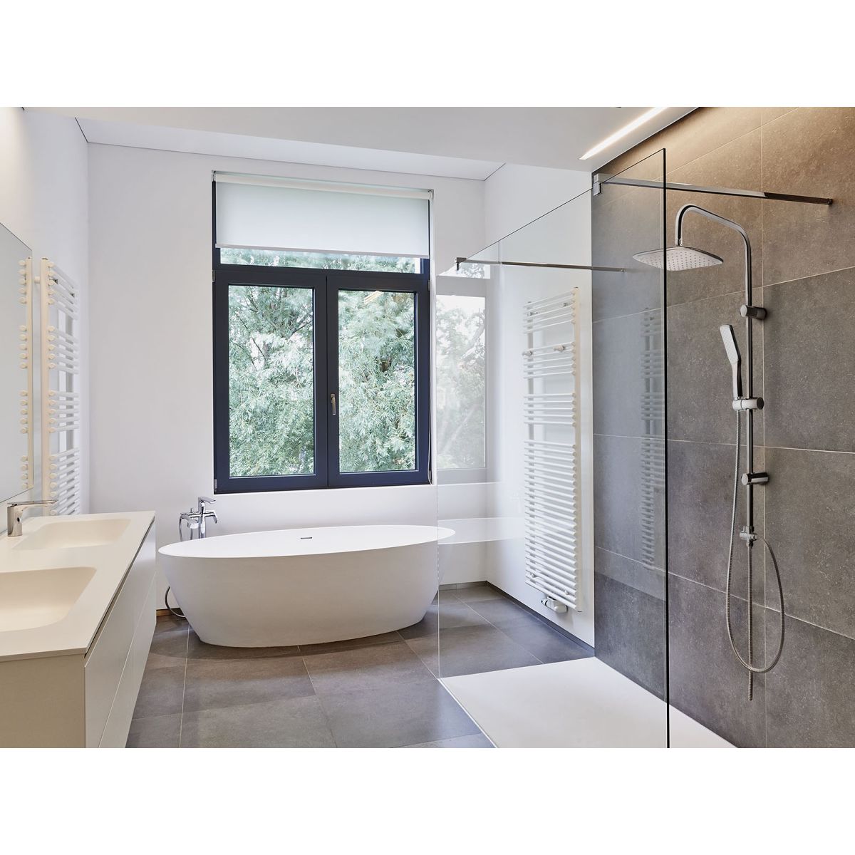 El conjunto se ha creado a partir de la gama de grifería de baño Dokos. Todos los componentes encajan a la perfección para dar a su interior un aspecto pulcro y clásico.