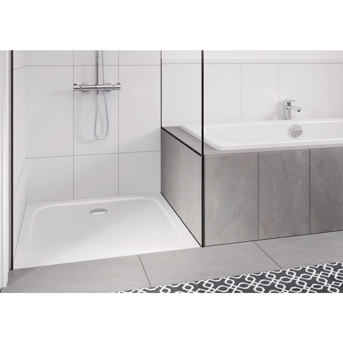 Plato de ducha plano de diseño clásico, con desagüe situado en el centro del lado más corto. Superficie de apoyo amplia y homogénea. Perfectamente coordinado con los productos de la familia Cayono.