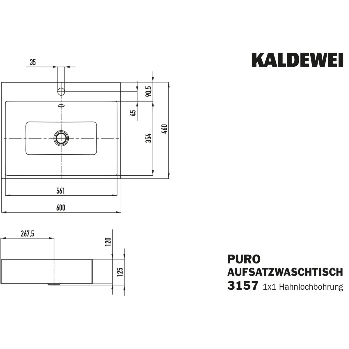 Kaldewei Puro lavabo 60x46 cm rectangular sobre encimera blanco 900706013001