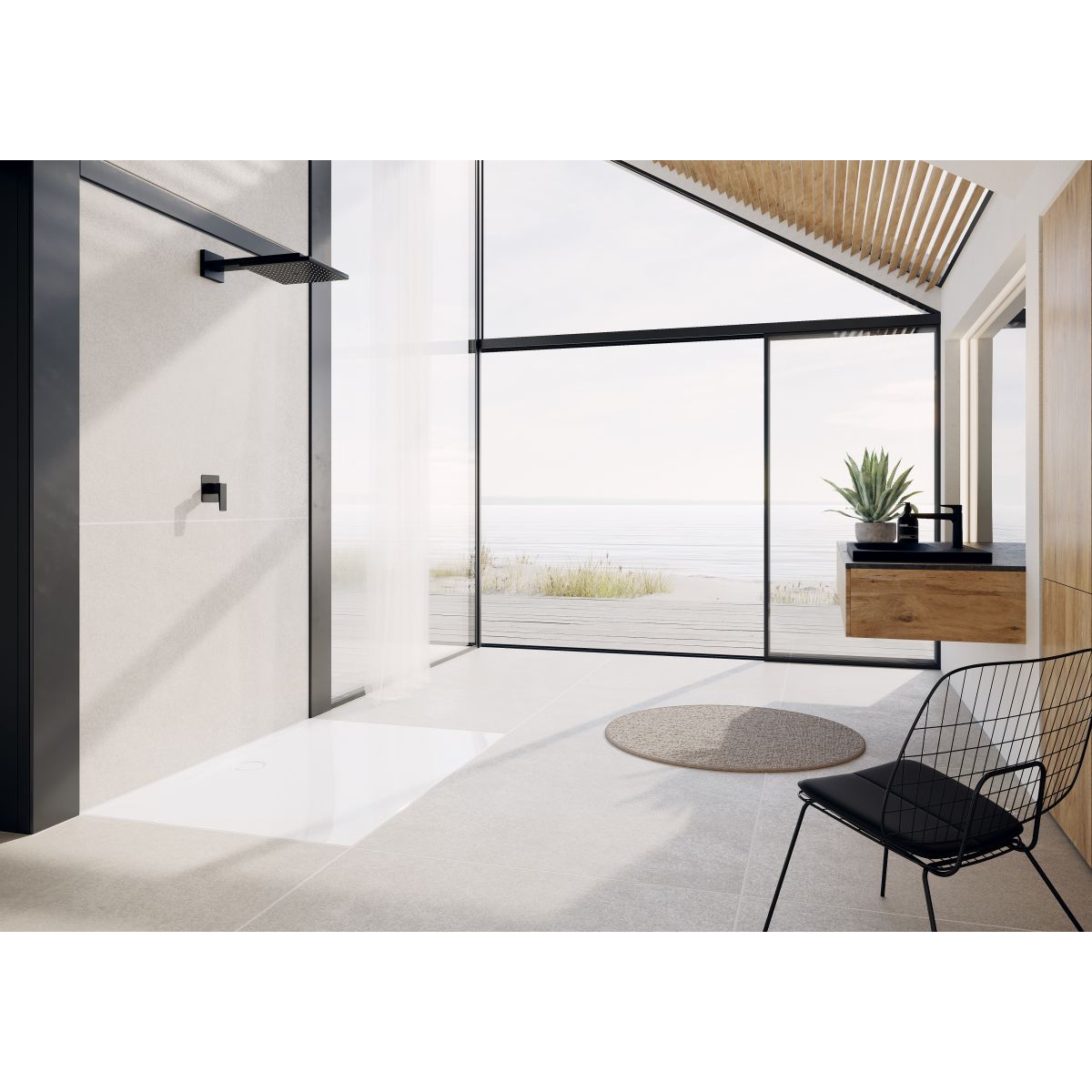 Plato de ducha plano con un diseño muy moderno, con desagüe situado en el centro del lado más largo. Superficie amplia y homogénea para pisar. Se puede combinar con una tapa de desagüe cromada o con una tapa de desagüe esmaltada del mismo color que el plato de ducha (se vende por separado).