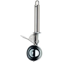 La cuchara para helados Rondo con la práctica función de expulsión de bolas permite preparar bolas de helado bien formadas. La cuchara de helado de acero inoxidable tiene un diámetro de 6 cm y una longitud de 23 cm.