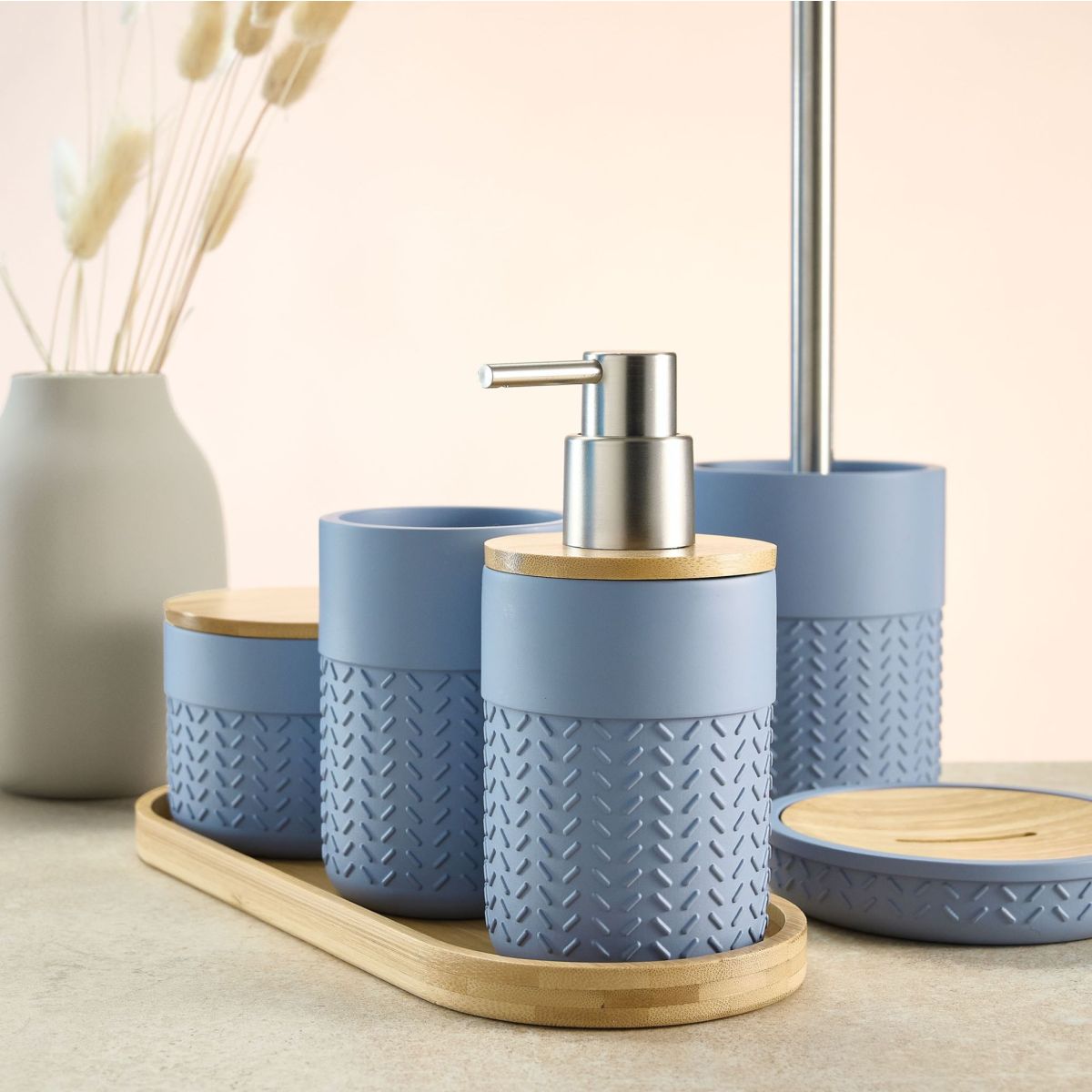 Descubra la serie de accesorios Dash de Kleine Wolke y convierta su cuarto de baño en su habitación favorita. El intemporal diseño en espiga llama la atención en cualquier cuarto de baño o aseo, y se complementa con elementos de bambú en el dispensador, la jabonera y la caja. Gracias a su elaboración de alta calidad, los accesorios durarán mucho tiempo, incluso con un uso frecuente. La superficie interior no porosa puede limpiarse fácilmente, lo que resulta especialmente higiénico. Estos bonitos accesorios harán de su cuarto de baño un lugar donde desconectar y relajarse cada día.
