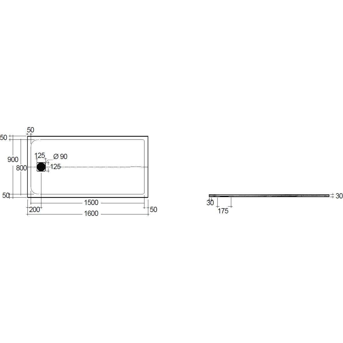 - desagüe situado en el centro a lo largo del lado más corto Ø 9 cm