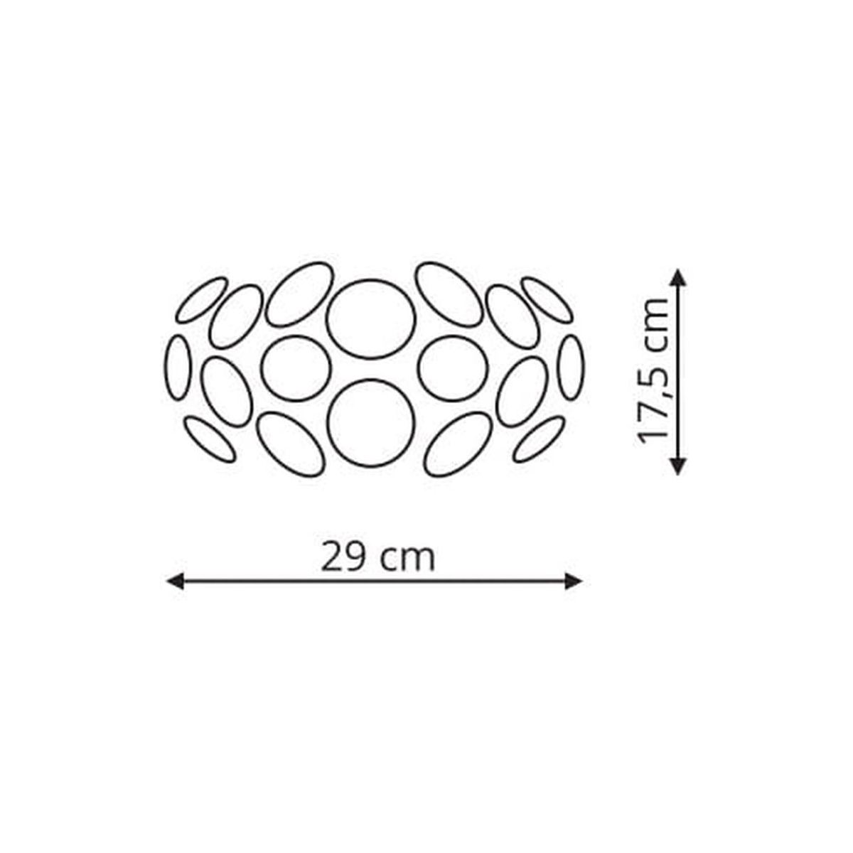 Mantenida en el estilo italiano, la luminaria presenta una semiesfera plateada, cromada, de tamaño medio, con pequeñas hendiduras circulares en toda su superficie.