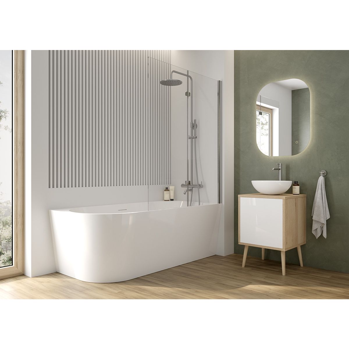 La versión angular especialmente diseñada permite adaptar la bañera a la zona de ducha, lo que ofrece la posibilidad de instalar un mamparo. También permite ahorrar espacio en el cuarto de baño.