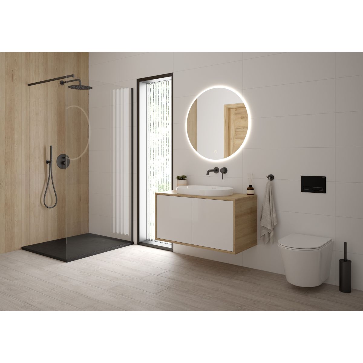 El color negro de la baldosa se ve acentuado por los bordes cromados de los botones. Esta combinación complementa a la perfección el estilo del producto, creando una solución inusual.
