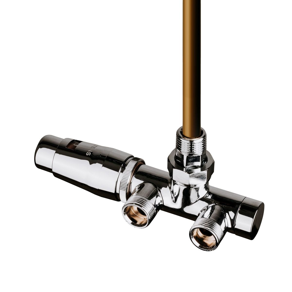 El kit de conexión de un solo orificio consta de una válvula combinada con válvula termostática y válvula de cierre, un cabezal termostático de la marca Oltens fijado al cuerpo de la válvula y un tubo colector de 30 cm.