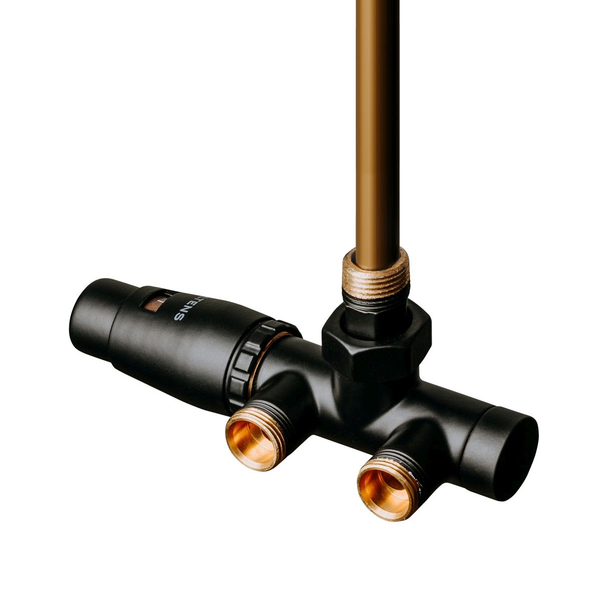El kit de conexión de un solo orificio consta de una válvula combinada con válvula termostática y válvula de cierre, un cabezal termostático de la marca Oltens fijado al cuerpo de la válvula y un tubo colector de 30 cm.