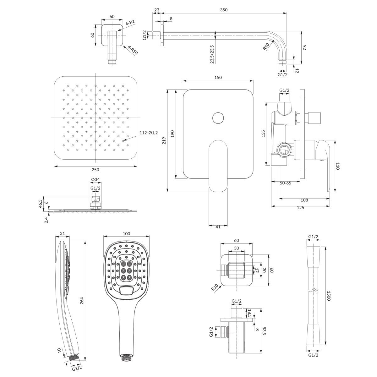 - Incluye: grifo con conmutador, ducha con efecto lluvia, alcachofa de ducha, manguera de ducha, soporte de ducha, conexión en ángulo
