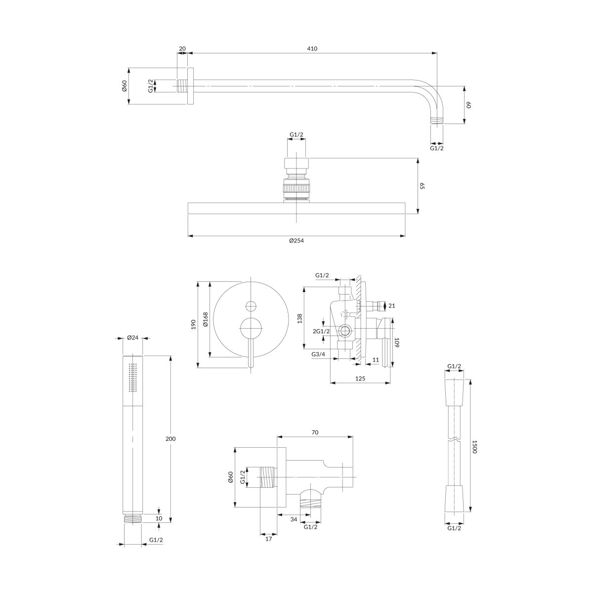 - Incluye: grifo con conmutador, ducha con efecto lluvia, alcachofa de ducha, manguera de ducha, brazo de ducha, conexión en ángulo
