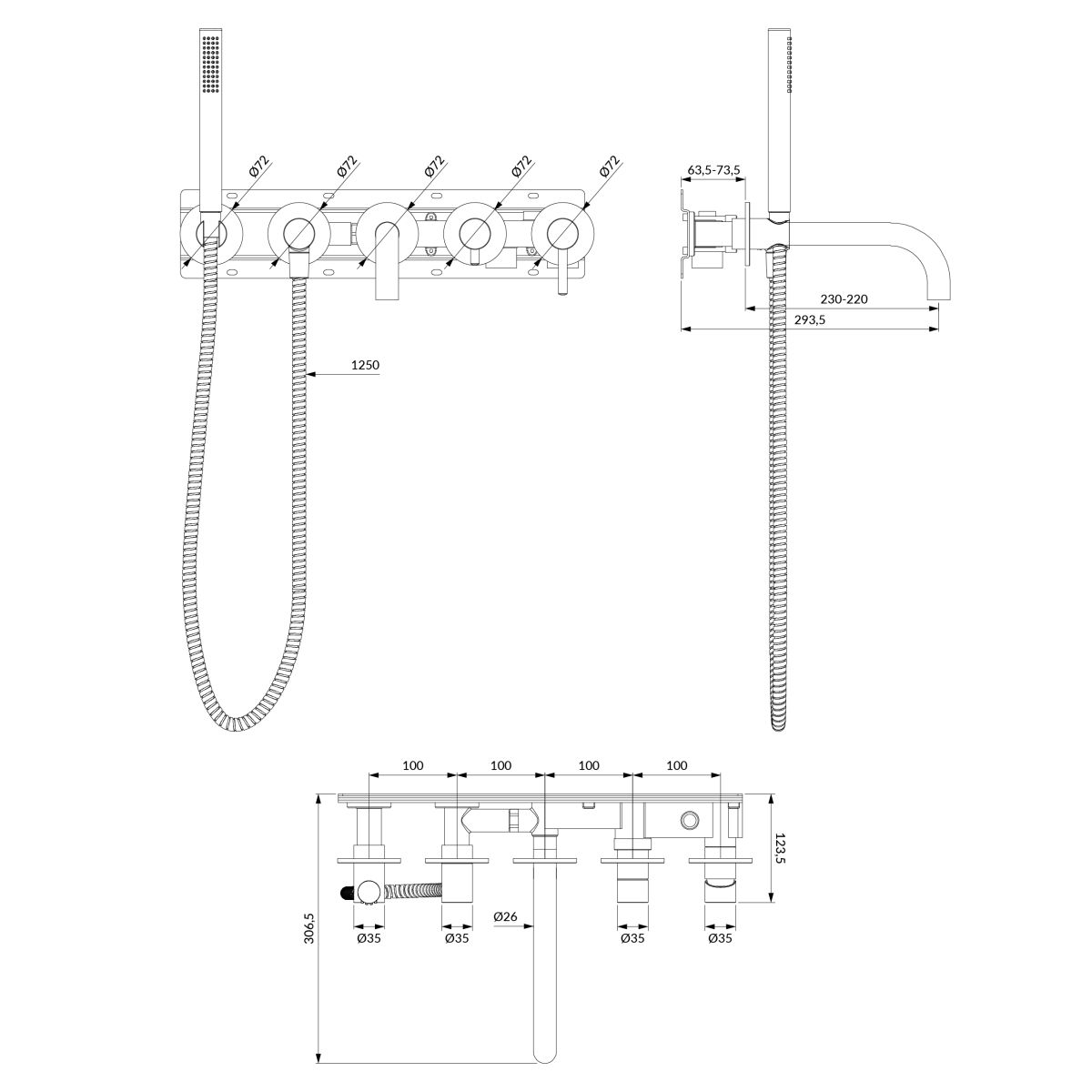 Y | Mezclador de bañera de instalación oculta de 5 orificios con caño largo