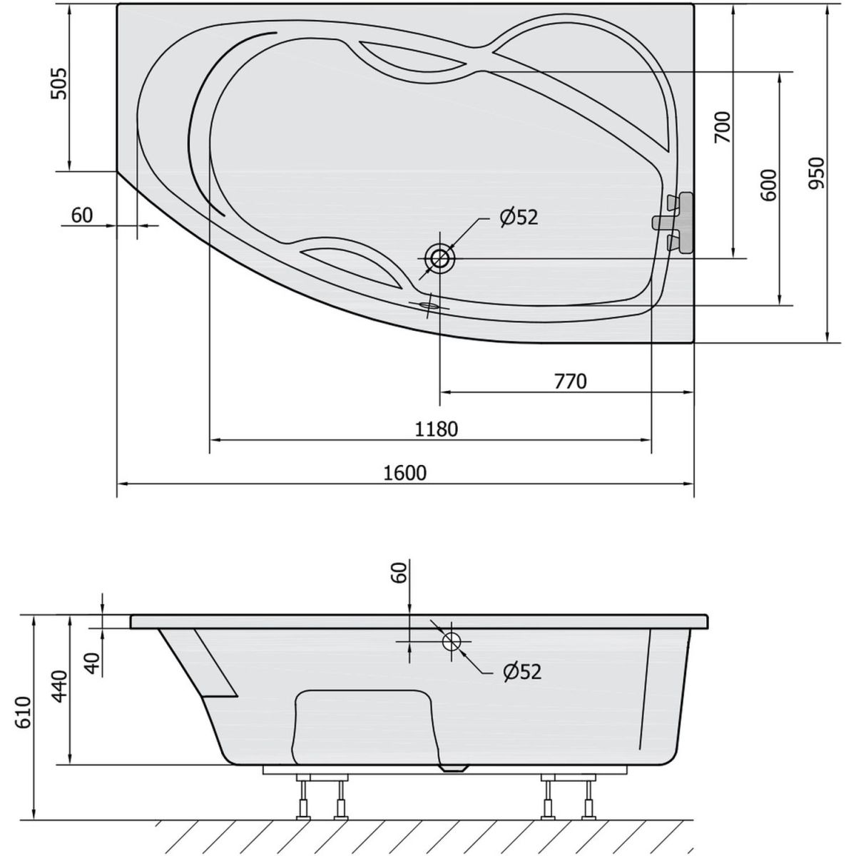 - diámetro del desagüe 52 mm