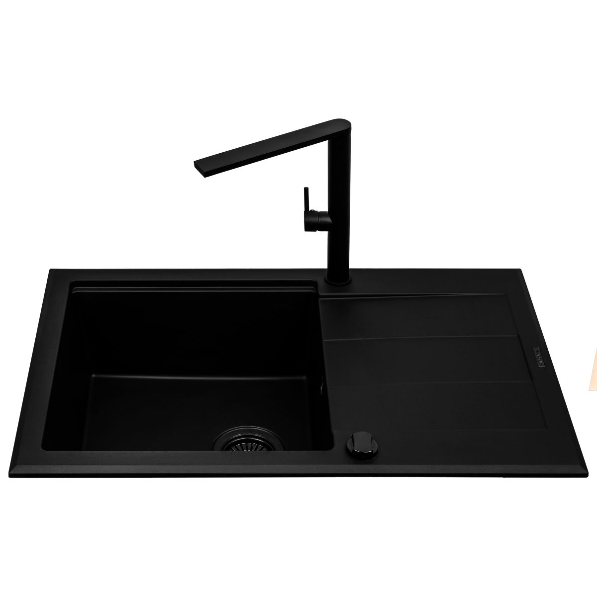 Fregadero Sparta (78x48) completo con el nuevo grifo mezclador Trigono - todos los componentes en negro. Los fregaderos Pyramis son famosos por su alta calidad y diseño innovador.