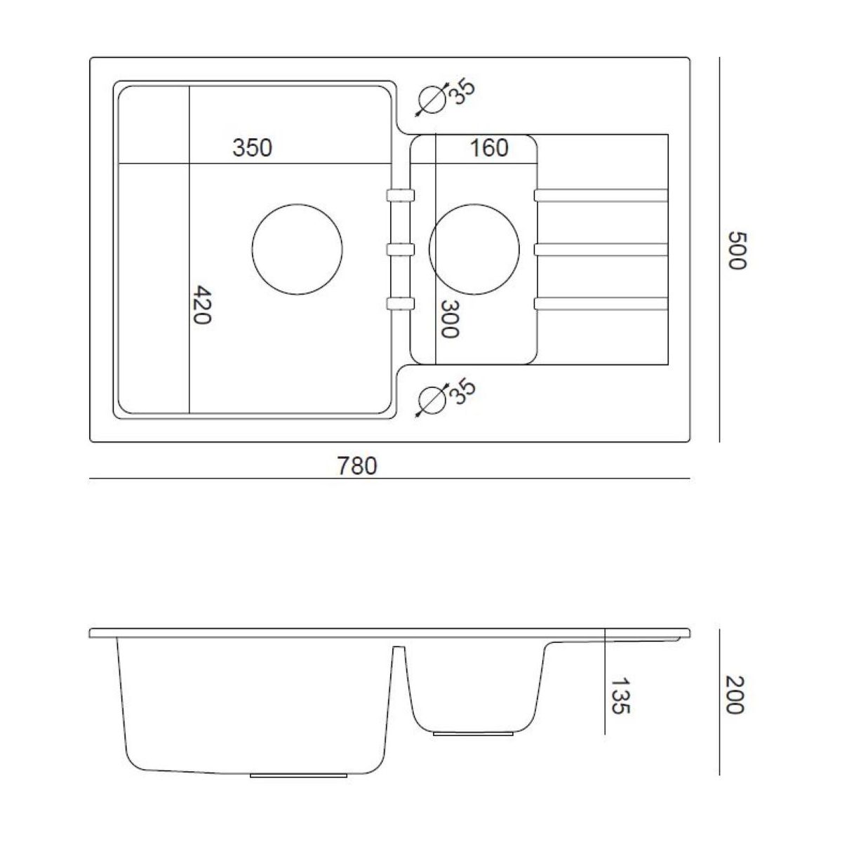 -fregadero de 78x50x20 cm con sifón manual para ahorrar espacio en el mueble (subestructura mínima de 60 cm)