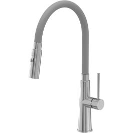 El mezclador de cocina Gina es un mezclador de acero con caño flexible móvil e interruptor para la función de ducha.