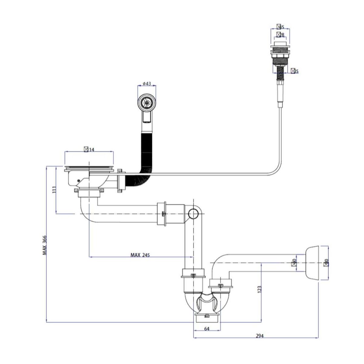 Sifón de desagüe vertical de 3,5". Está diseñado para fregaderos de granito de 1 seno con o sin escurridor. Automático con botón Push to Open. Existe la posibilidad de conectarlo a un lavavajillas.