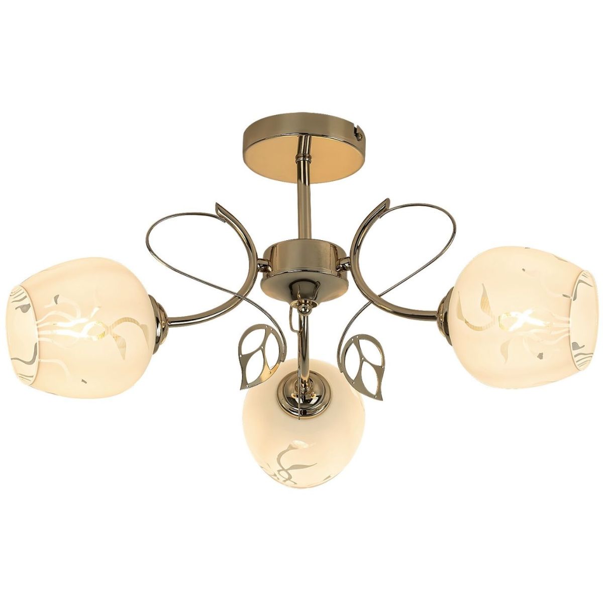 La clásica lámpara de techo triple Fauna será un elegante complemento para el mobiliario tradicional de su salón o dormitorio. Las pantallas de cristal blanco estampado están sujetas a una estructura de metal dorado. La lámpara puede fijarse al techo con una base decorativa redonda. Las pantallas redondas de fondo abierto se sujetan a los brazos retorcidos de la lámpara y están decoradas con hojas doradas.