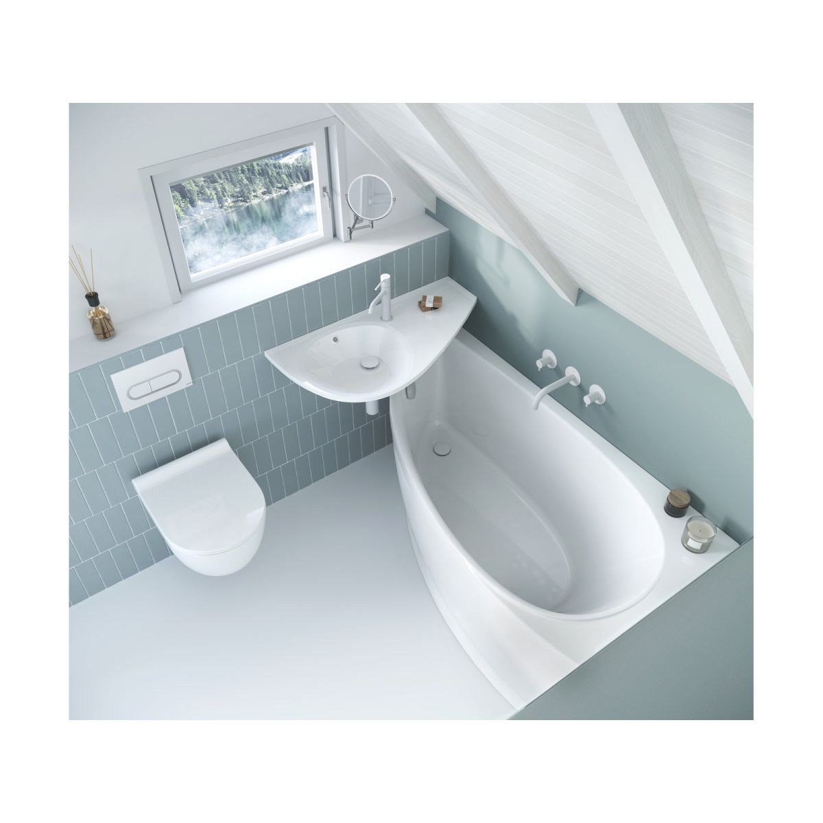 La bañera y el lavabo Avocado son la solución ideal para cuartos de baño pequeños. El conjunto, adaptado con estilo, aprovecha el espacio de forma inteligente, lo que le permite caber en un espacio de 2 m². El lavabo puede colgarse directamente encima de la bañera, dejando espacio suficiente para lavarse y bañarse.